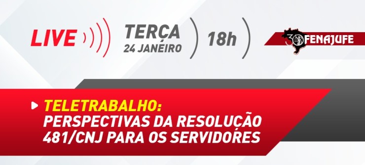 Com o tema teletrabalho : perspectivas da resolução 481/ CNJ para servidores e servidoras, a Fenajufe vai realizar uma live hoje (24), a partir das 18 horas.Objetivo do debate é tirar dúvidas e buscar possíveis soluções jurídicas sobre o assunto…