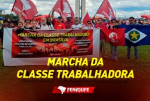 A Fenajufe e os sindicatos de base se somaram às diversas entidades do movimento sindical, social e centrais para a Marcha da Classe Trabalhadora, em Brasília-DF, na última quarta-feira (15). A mobilização reuniu trabalhadores e trabalhadoras de vários segmentos, de todos os cantos do País, em marcha do Teatro Nacional até o Congresso Nacional.