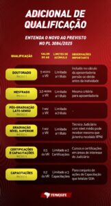 Entre as sugestões, a Federação solicita a inclusão de um acréscimo de 1 VR (Valor de Referência) no adicional de qualificação (AQ), elevando o limite de 2 para 3 VR, conforme proposta original aprovada no Fórum de Carreira do CNJ. O pedido dialoga diretamente com o Projeto de Lei nº 3084/2025, que trata do AQ e tramita na Câmara dos Deputados em regime de urgência, podendo ser votado diretamente em plenário nos próximos dias. Após aprovação, o texto seguirá para o Senado Federal.