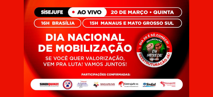 Nesta quinta-feira, 20 de março, às 15h (horário de Manaus), o SitraAM/RR participa de uma live promovida pelo Sisejufe, em alusão ao Dia Nacional de Mobilização pela valorização dos servidores do Judiciário federal. O evento será transmitido pelo canal do…
