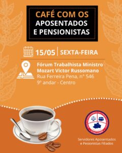 O SitraAM/RR realiza, no próximo dia 15 de maio, uma sexta-feira, mais uma edição dos “Café com os Aposentados e Pensionistas”, voltado aos servidores filiados. O encontro acontece no Fórum Trabalhista Ministro Mozart Victor Russomano, localizado na Rua Ferreira Pena, nº 546, 9º andar, no Centro, e reúne uma programação que vai além da confraternização tradicional, com oferta de serviços e informações relevantes para o público.